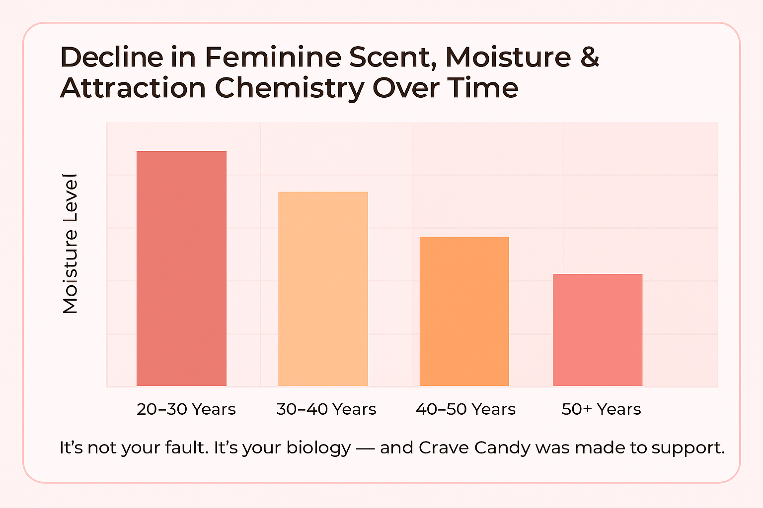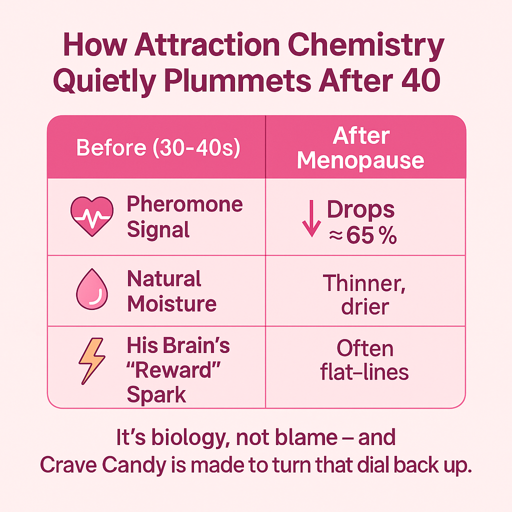 Crave Candy targets the two silent dials menopause turns down—moisture & pheromone signal—so mid-life wives swap that roommate vibe for butterflies again.